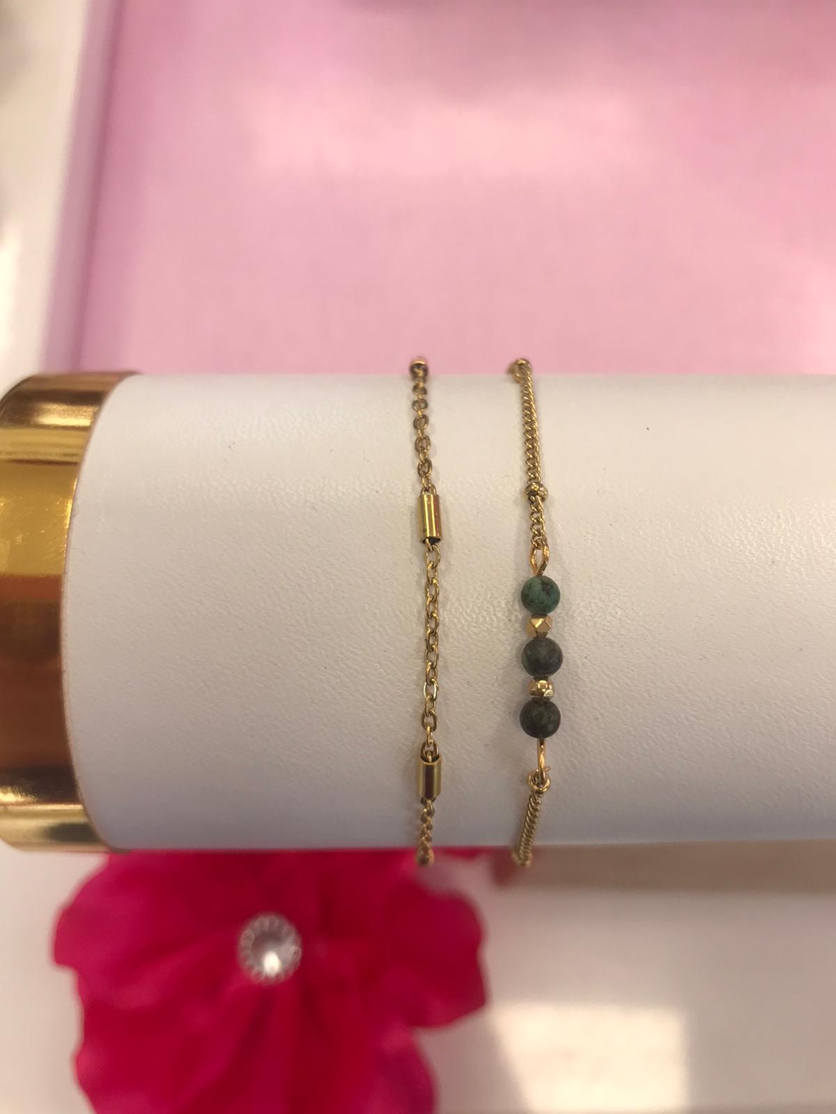Set di bracciali dorati con piccole maglie e pietre turchesi da usare in coppia o singolarmente.
